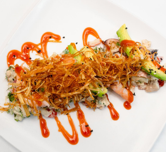 Mix de mariscos (camarón, calamar, pulpo, surimi, pescado, marlin), marinada en una salsa de soya de la casa, acompañada de pepino, cebolla morada, cubos de mango, guacamole y salsa de habanero caramelizada.