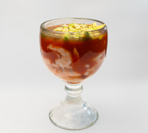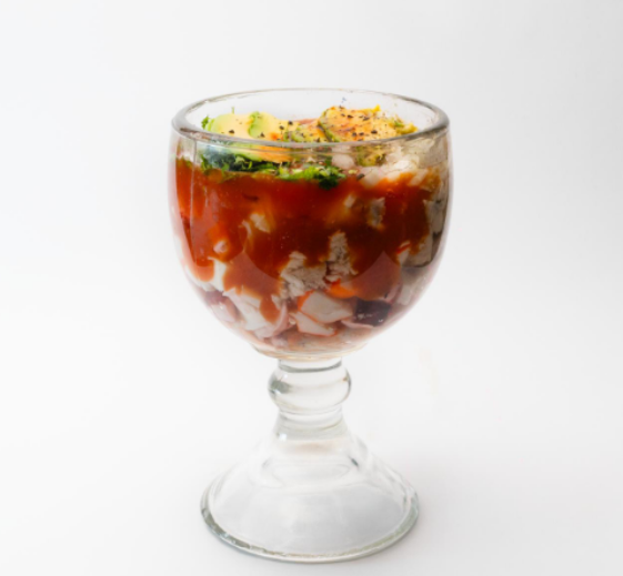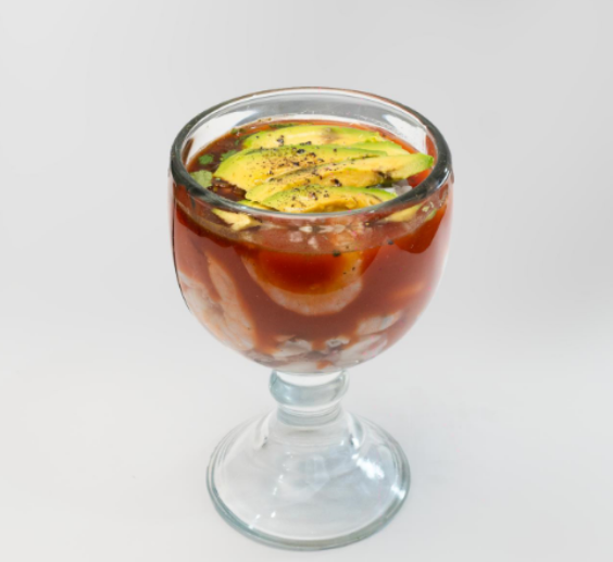 Catsup preparada de la casa, mix de mariscos (camarón, pulpo, calamar, surimi, pescado, marlín y ostión), cebolla, cilantro, aguacate, sal, pimienta, orégano, aceite de olivo y salsa soya. / Base de jugo de limón, camarón, cilantro, cebolla, jitomate, chile serrano, aguacate, sal, pimienta, oregano, aceite de olivo y salsa soya.
