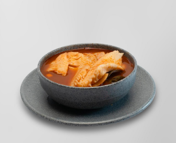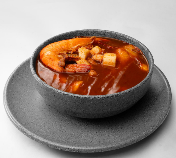Base de caldo de camarón, filete tilapia, papa, zanahoria y almejas.