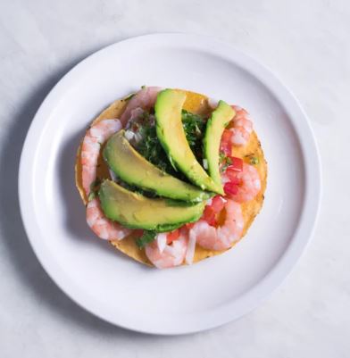 Camarón, montado sobre una tostada de maíz, cilantro, cebolla, jitomate, mayonesa, catsup, sal, pimienta, orégano, aceite de olivo y salsa soya.
