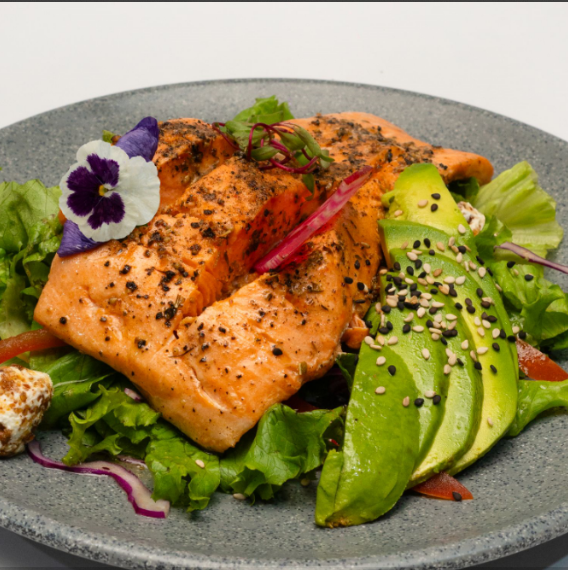 Porción de salmón sazonada a las finas hierbas, acompañada de arroz y ensalada tipo pampera.