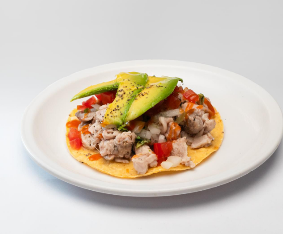 Pescado, montado sobre una tostada de maíz, cilantro, cebolla, jitomate, mayonesa, catsup, sal, pimienta, orégano, aceite de olivo y salsa soya.