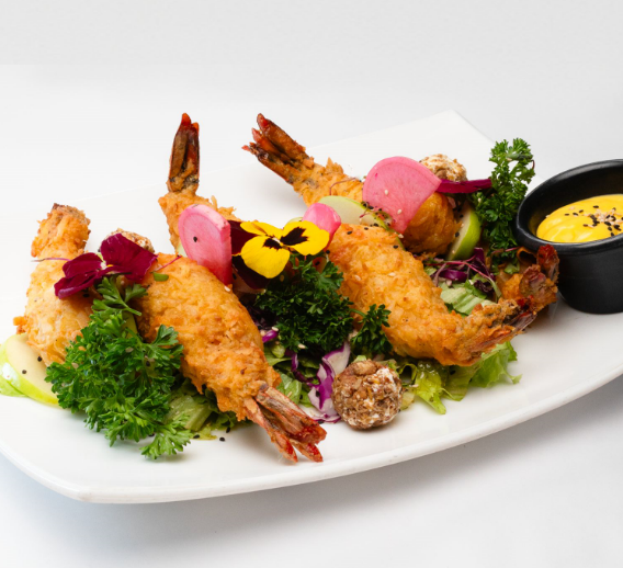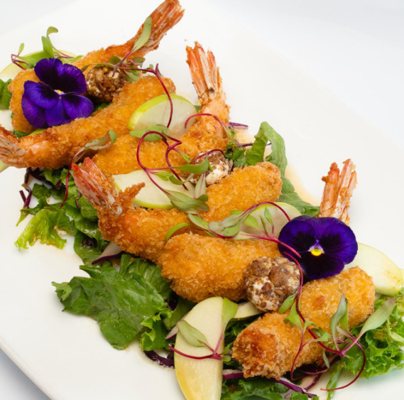 Camarones empanizados con panko, rellenos con queso Oaxaca acompañados con ensalada tipo pampera.