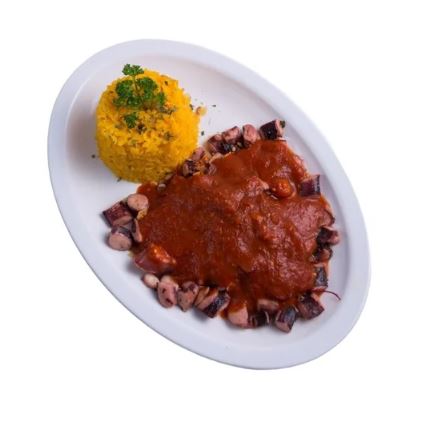 Pulpo sazonado con chile cuaresmeño, cebolla, jitomate, aceitunas, alcaparras, hierbas de olor, epazote, tinta de calamar, acompañado de arroz.
