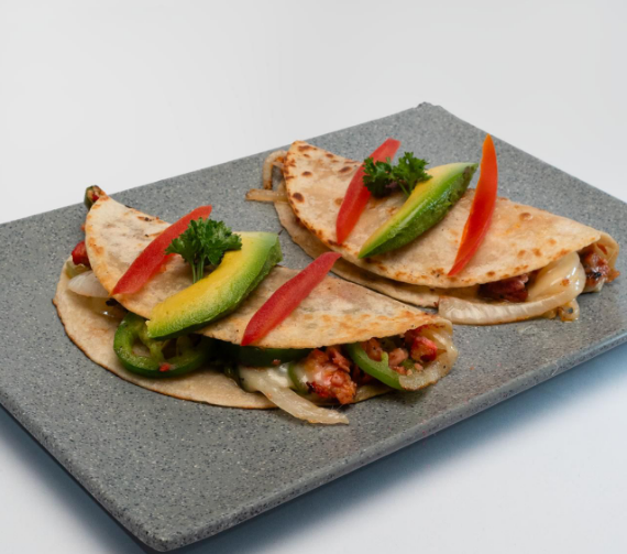 Quesadillas de pescado, sazonado a la mexicana, acompañado con un pico de gallo (jitomate, cilantro y cebolla) y aguacate.