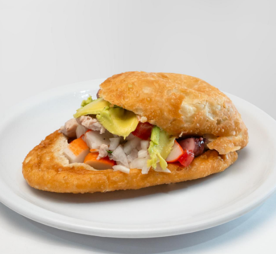 Empanada rellena de atún a la mexicana y mix de mariscos (camarón, pulpo, calamar, surimi, pescado, marlín), acompañado de cilantro, cebolla, jitomate, aguacate, mayonesa, catsup, sal, pimienta, orégano y salsa soya.