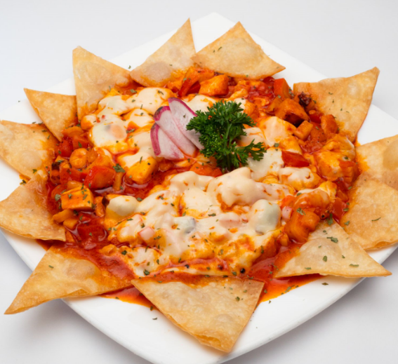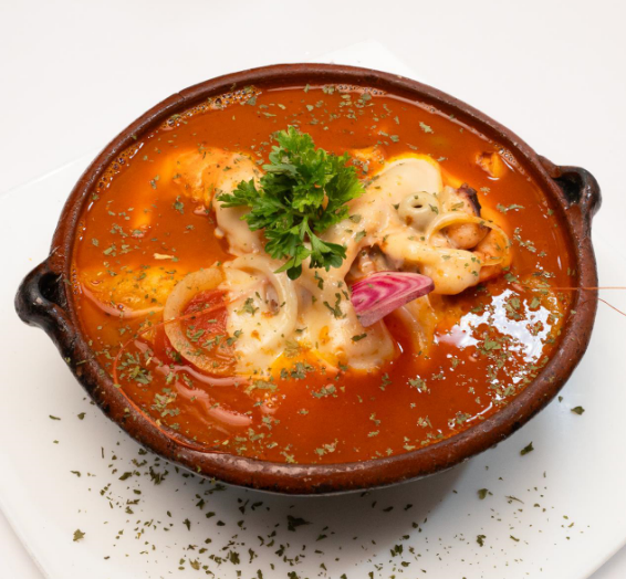 Mix de mariscos (surimi, calamar, camarón), sazonada con una salsa de chiles mixtos (diabla), jitomate, piña y gratinada con queso manchego.