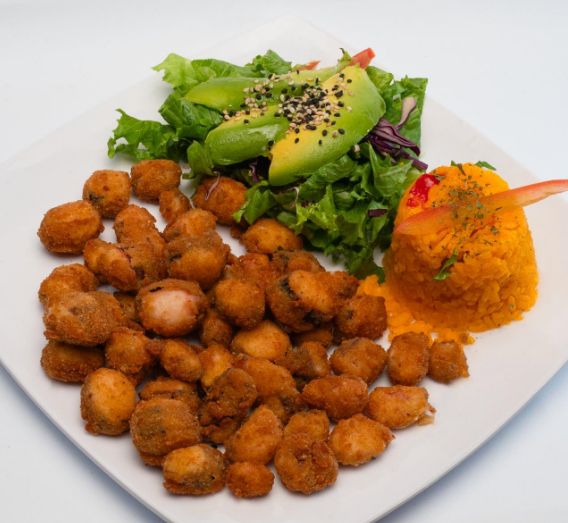 Camarones empanizados con panko, acompañados de arroz y ensalada.