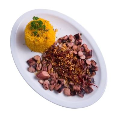 Pulpo sazonado a la mantequilla con finas hierbas, con un ligero toque de mayonesa, acompañado de puré de papa o frijoles.