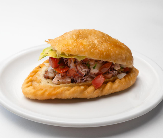 Empanada rellena de atún a la mexicana y pulpo, acompañada con jitomate, cebolla, cilantro, aguacate, mayonesa, catsup, sal, pimienta, orégano y salsa soya.