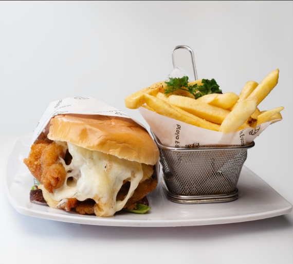 Camarón empanizado o a la plancha, jitomate, cebolla, lechuga, queso Oaxaca, piña, tocino y aderezo tipo mil islas.