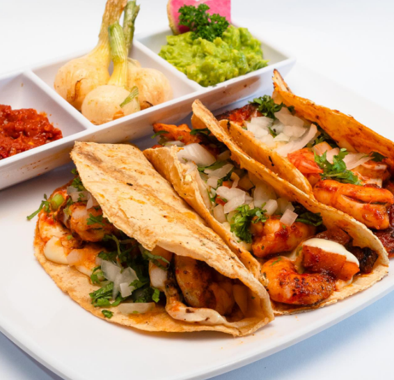 Camarón cristal, envuelto en queso Oaxaca, rebosado en harina, montados en tortilla de maíz, pico de gallo, zanahoria, jícama, col morada y aderezo ranch y costra de queso manchego.
