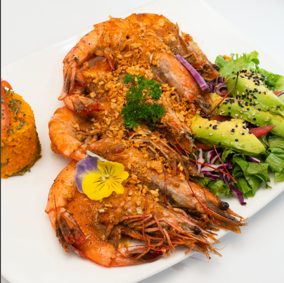 Camarones sazonados con una pasta de ajo y bañados con ajo dorado, acompañados de arroz y ensalada.