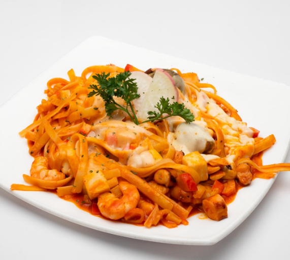 Pasta fettuccine a la crema, acompañada con camarón, surimi, calamar y almeja, gratinada con queso manchego.