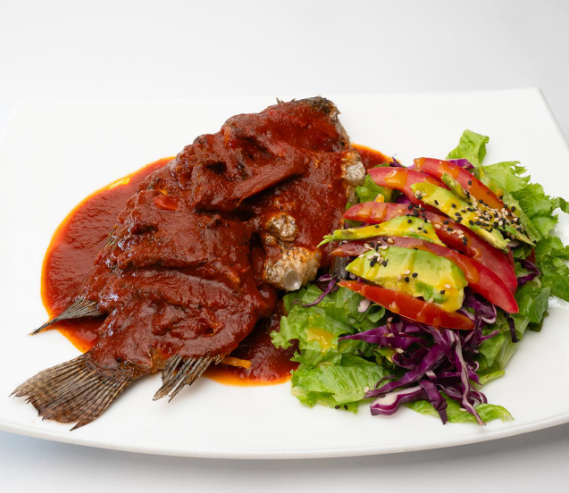 Mojarra frita en aceite, bañada con una pasta de chile guajillo y ajo dorado y acompañada de arroz y ensalada.