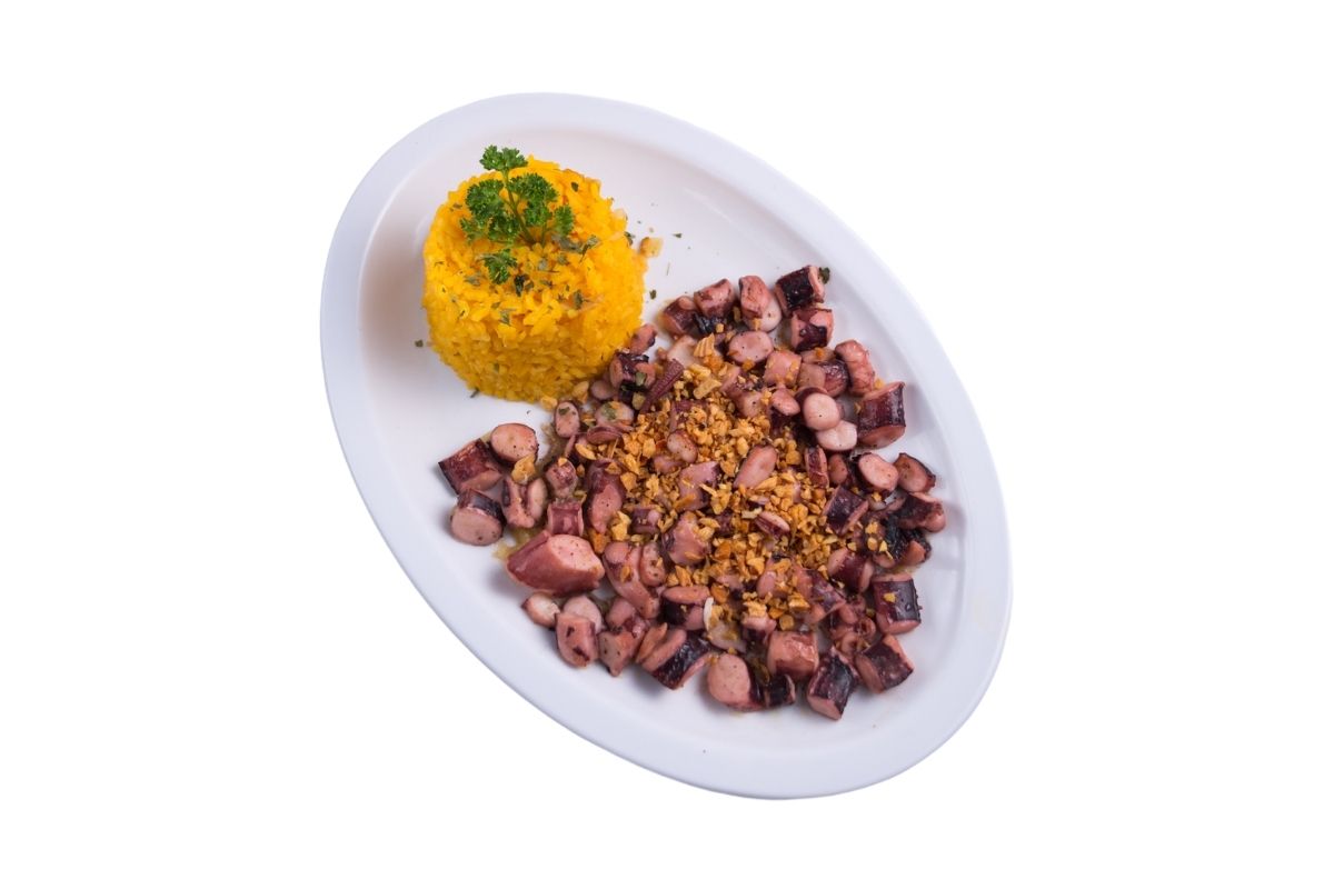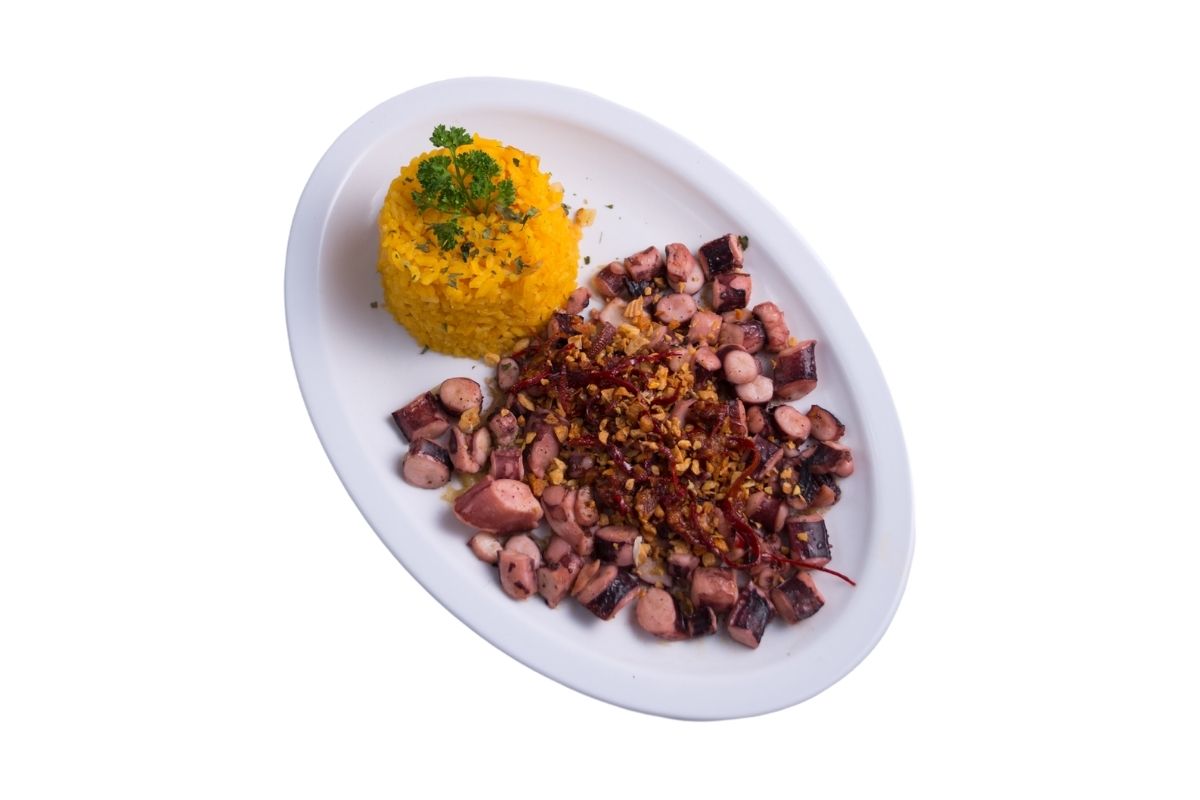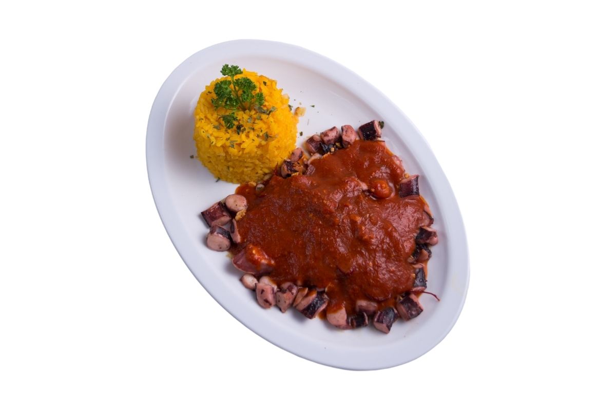 Calamar elaborado con pasta de ajo, ajo dorado, julianas de chile guajillo, acompañado con 100 gr de arroz.
