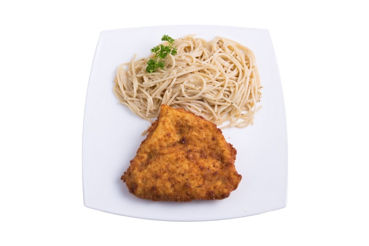 Pechuga rellena de jamón y queso manchego empanizada, acompañada con espagueti a la crema.