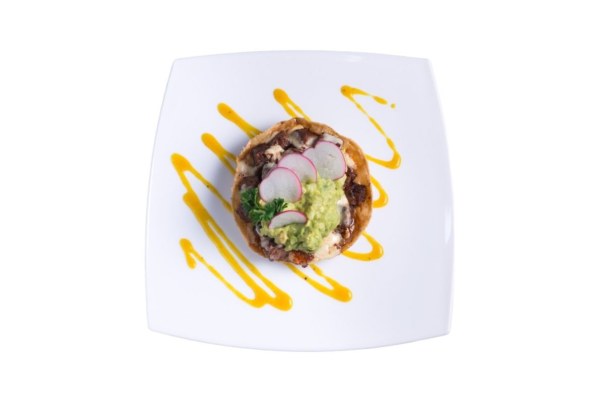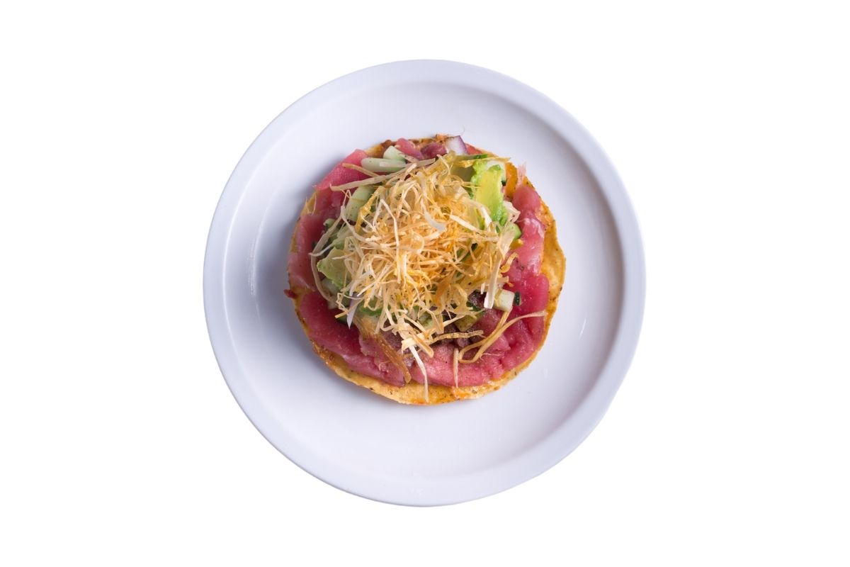 Atún elaborado a la plancha, sobre tortilla de maíz frita y guacamole, gratinado con queso oaxaca, acompañado con salsa de árbol de la casa.