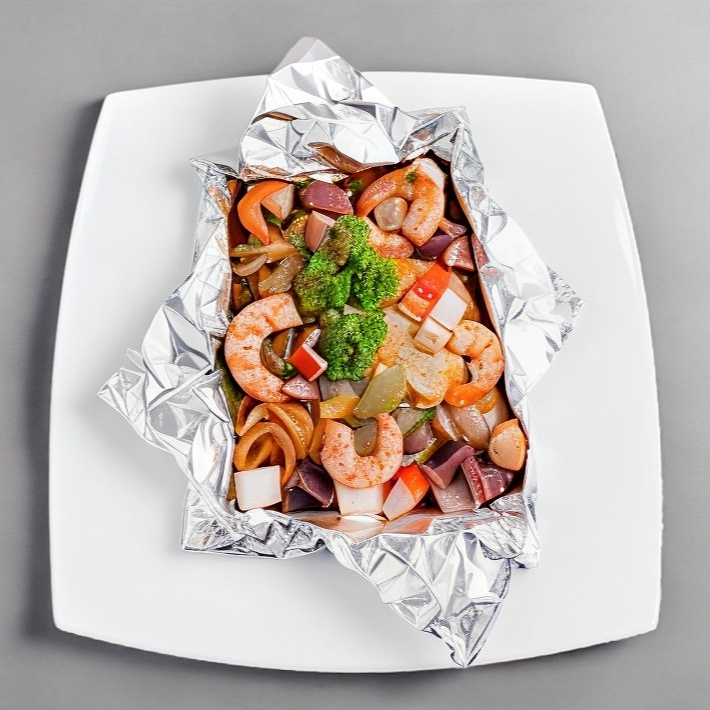 70 gr de filete, envuelto en aluminio, cocido al vapor con un mix de mariscos pulpo, camarón, caracol y surimi, gratinado con queso manchego, sazonado con epazote, hiervas de olor y jugo de naranja.