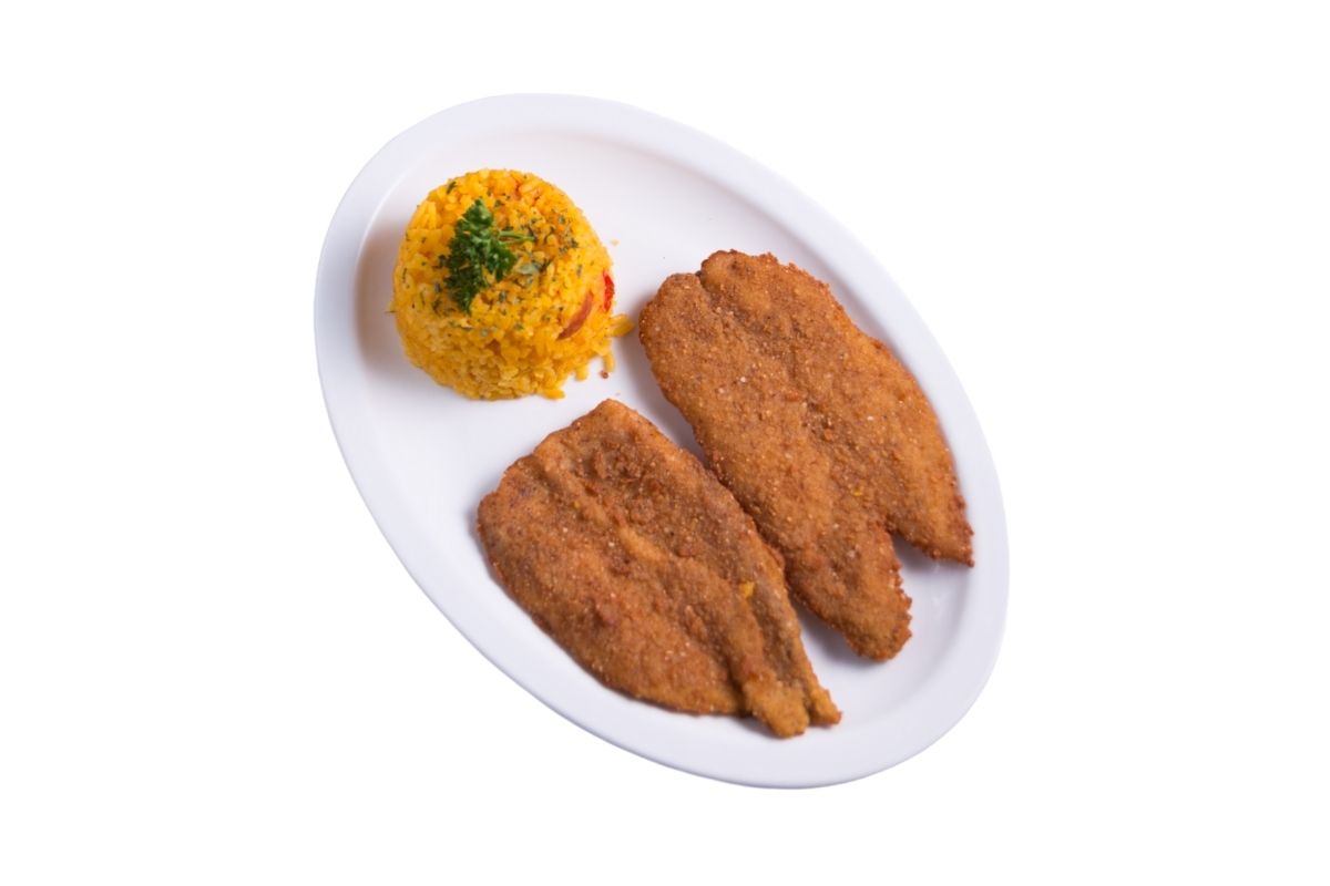 110 gr de filete empanizado, acompañado con arroz.