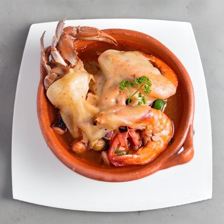 Base de caldo de camarón, elaborado con mix de mariscos, camarón, pulpo, pescado, surimi, jaiba entera, gratinada con manchego y sazonado con jitomate, cebolla, chile, aceitunas, alcaparras, epazote y hierbas de olor, acompañada con almeja, papa y zanahoria.