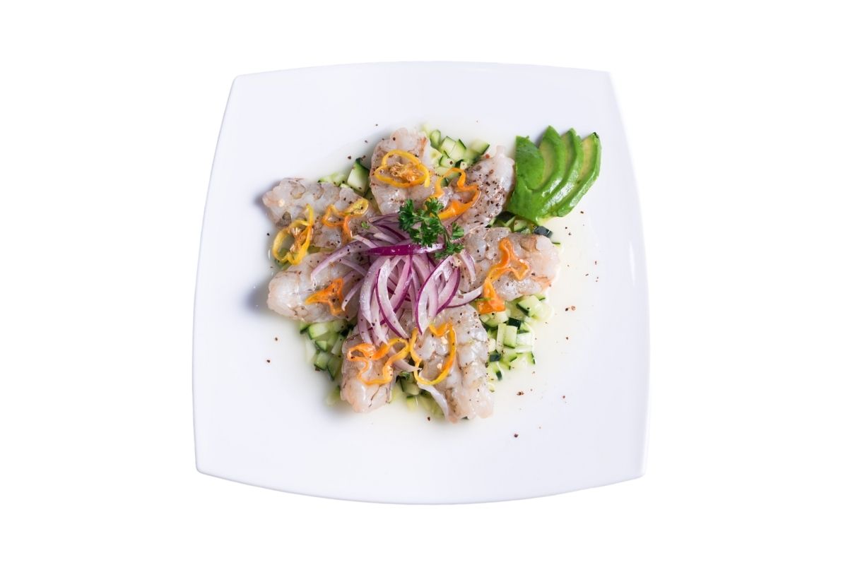 Camarón, cebolla morada, chile habanero, limón y pepino.