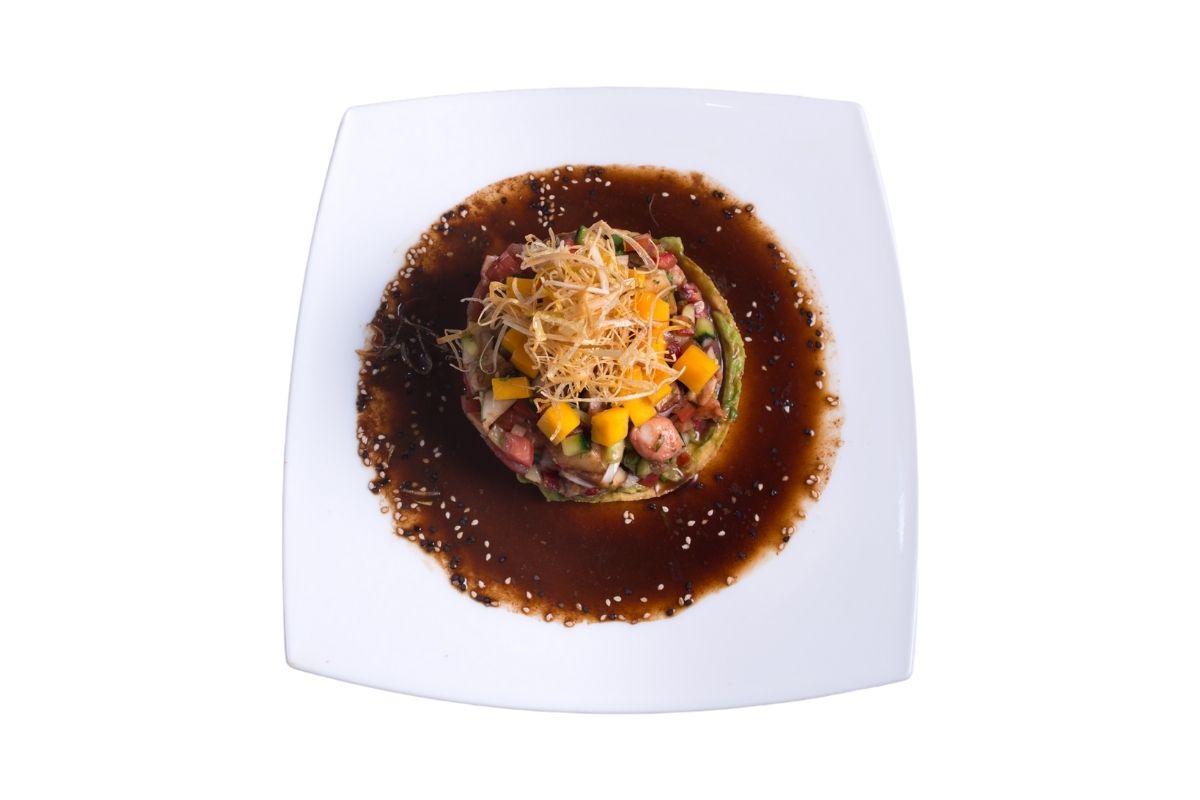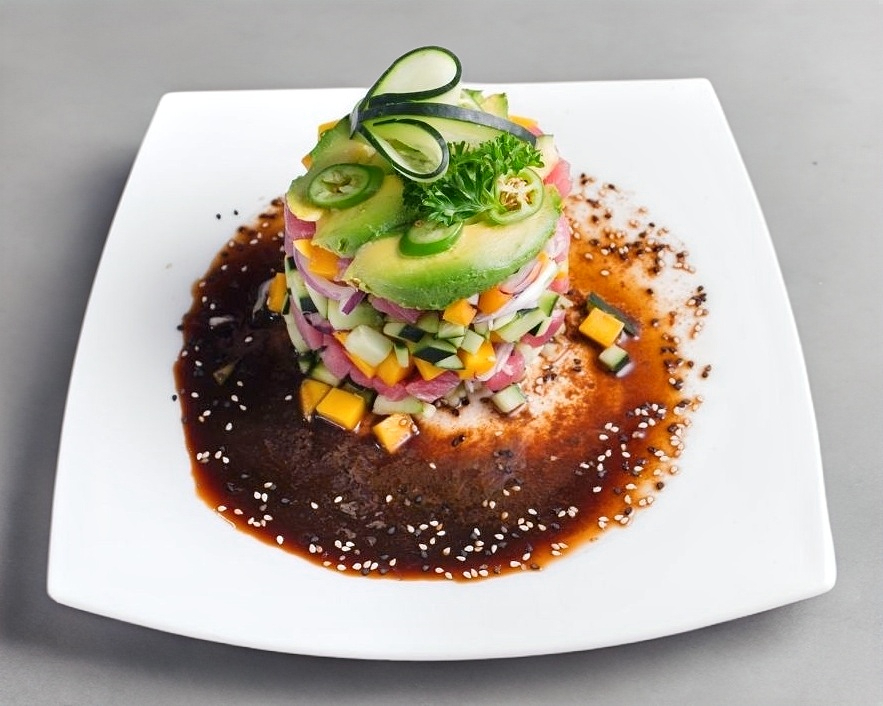 Cuadros de atún fresco, acompañados de cuadros de pepino, mango natural, guacamole, chile serrano y aderezado con salsa soya de la casa.