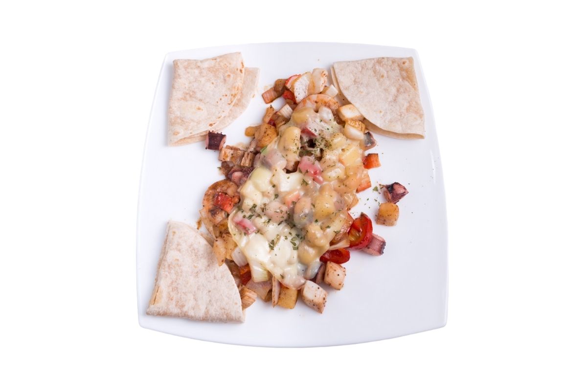 Mariscos sazonados con piña, tocino, pimiento, morrón, cebolla, gratinados con manchego, acompañado con tortillas de harina.