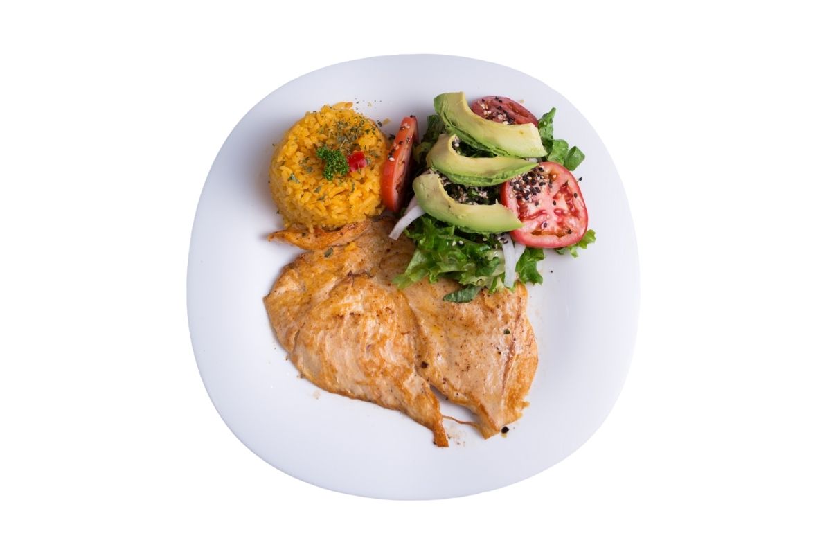 120 gr de pechuga, acompañado con 100 gr de arroz y ensalada.