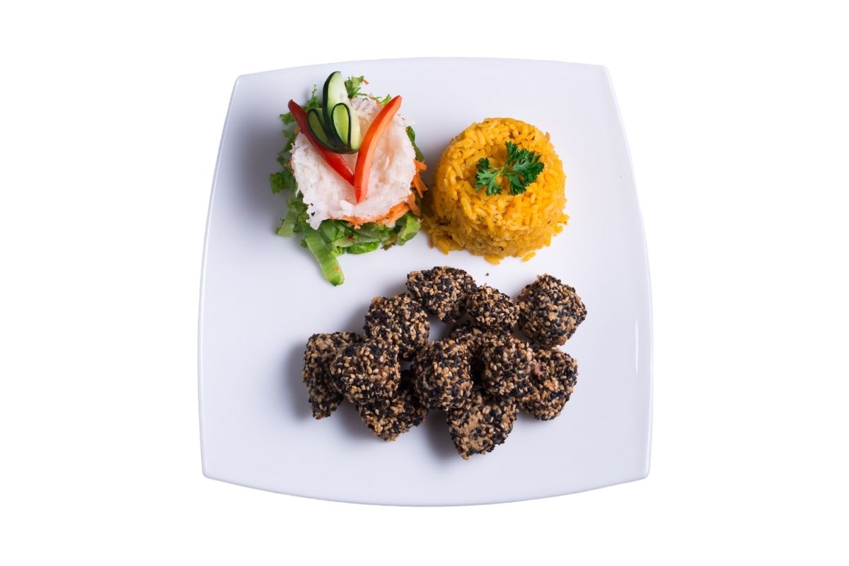 Cubierto con ajonjolí mixto, acompañado con arroz y ensalada.