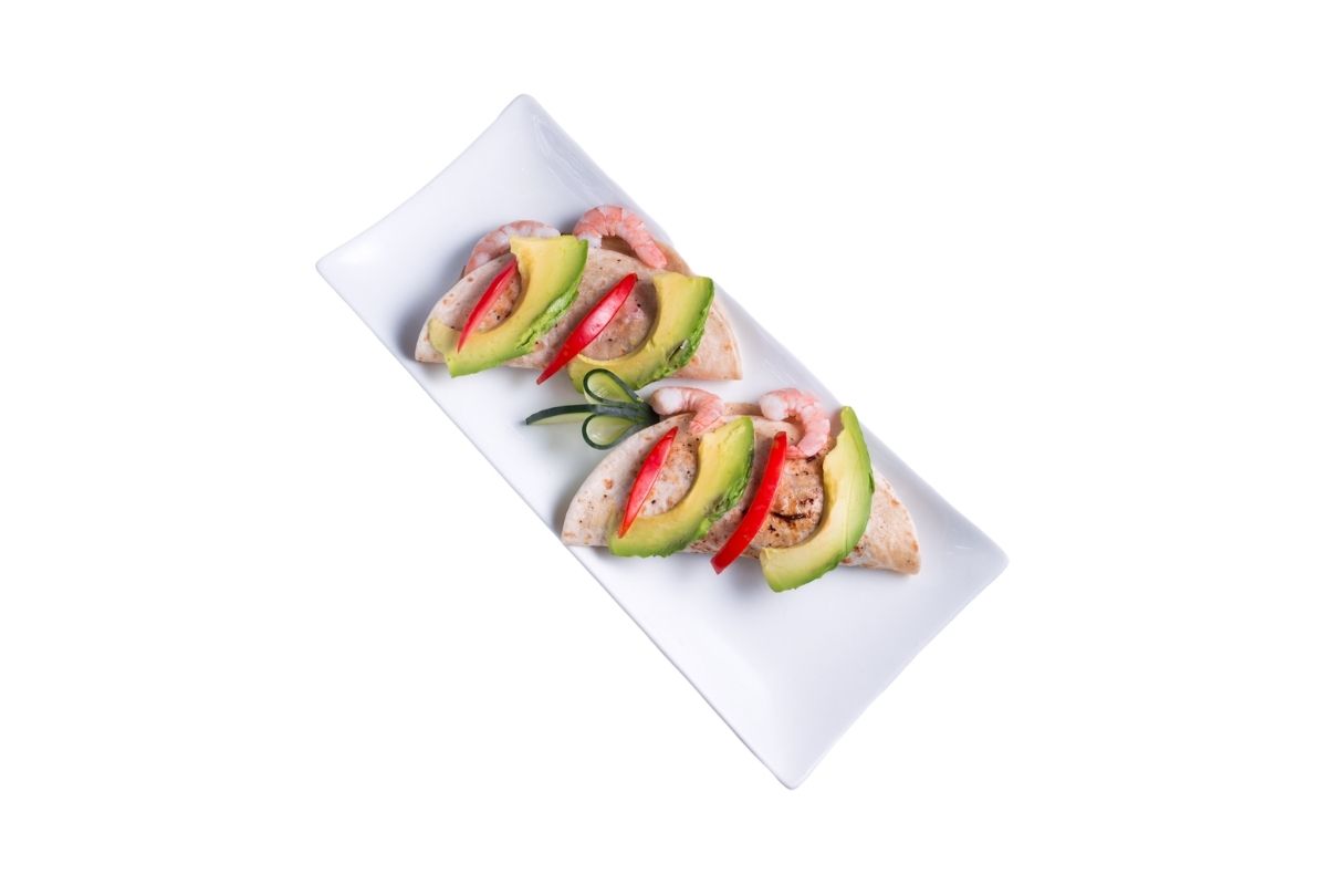 2 Piezas, elaborado con marli y camarón, pimiento morrón, frijoles, cebolla, tocino, gratinado con manchego y montado en toritllas de harina y aderezo de la casa.