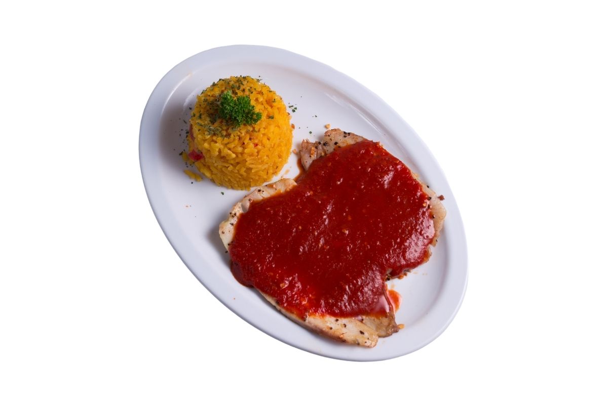 100 gr de filete a la plancha, bañado con salsa diabla, acompañado con 100 gr de arroz.