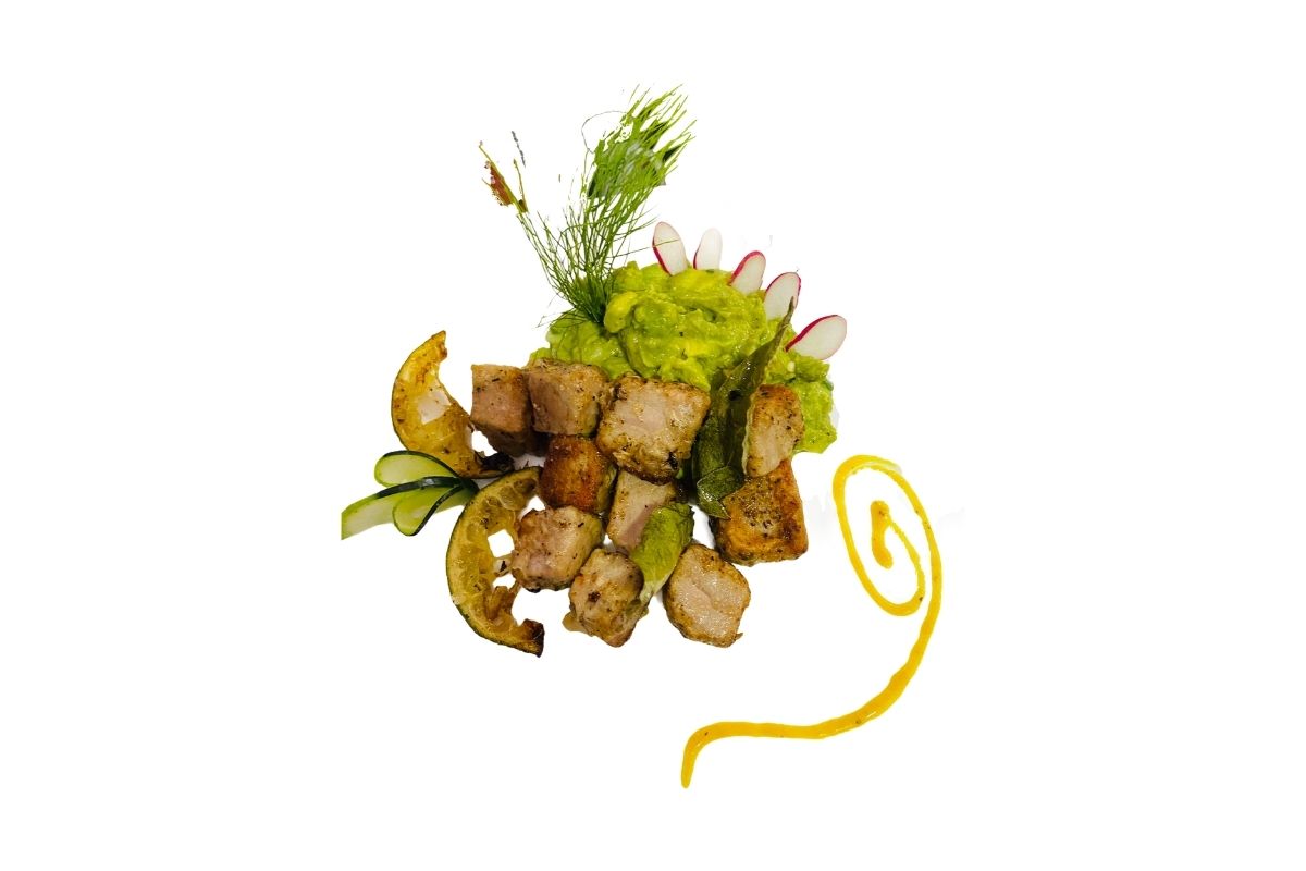 170 gr de salmón cubierto con chicharrón de cerdo, frito en aceite de olivo, acompañado con guacamole y chile habanero.