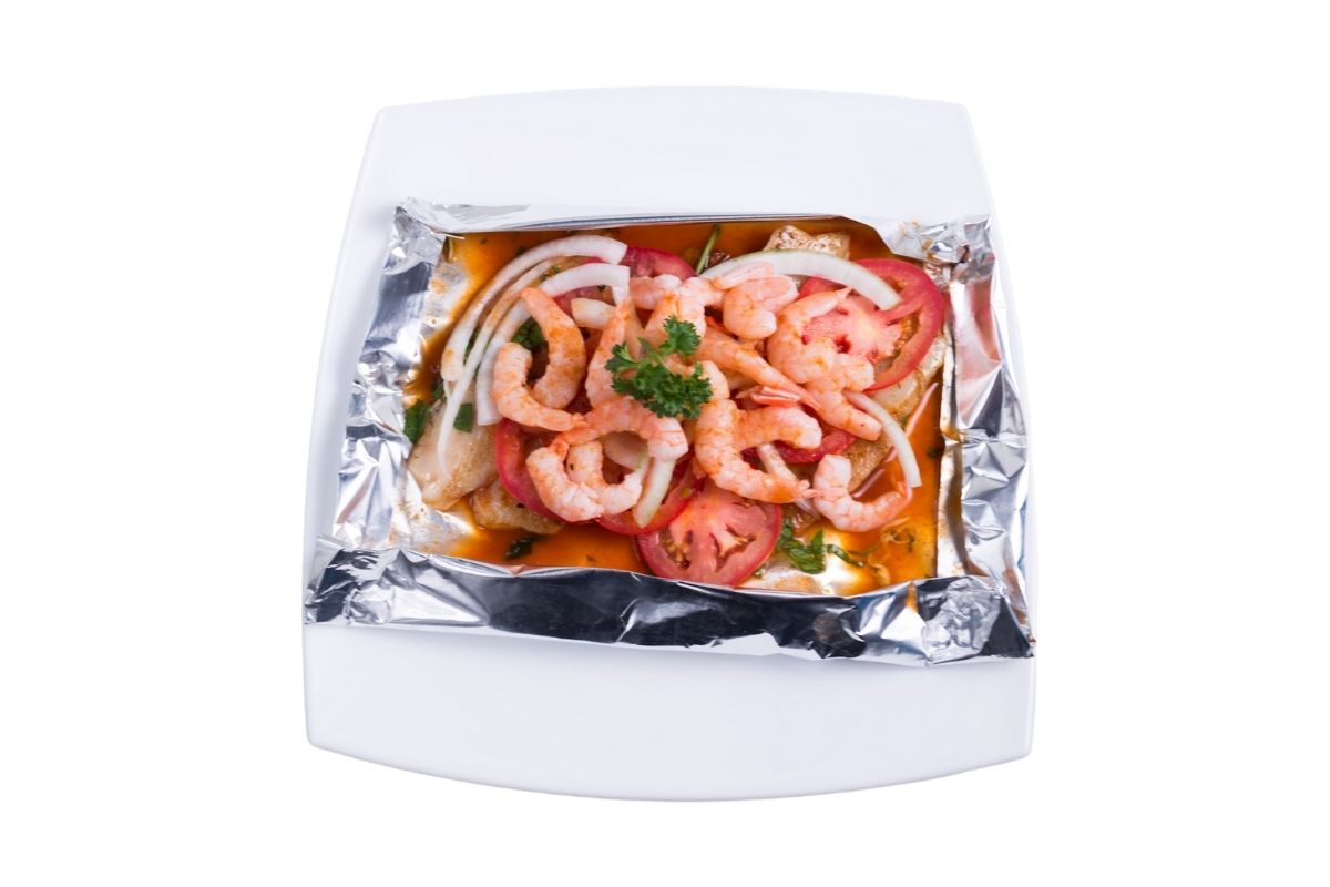 70 gr de pescado, bañado con camarón, envuelto en aluminio, cocido a vapor, elaborado con jitomate cebolla, chile, hierba santa, jugo de naranja y gratinado con manchego, acompañado de arroz.