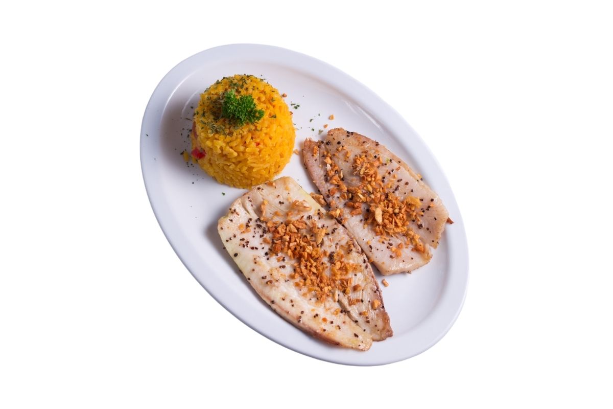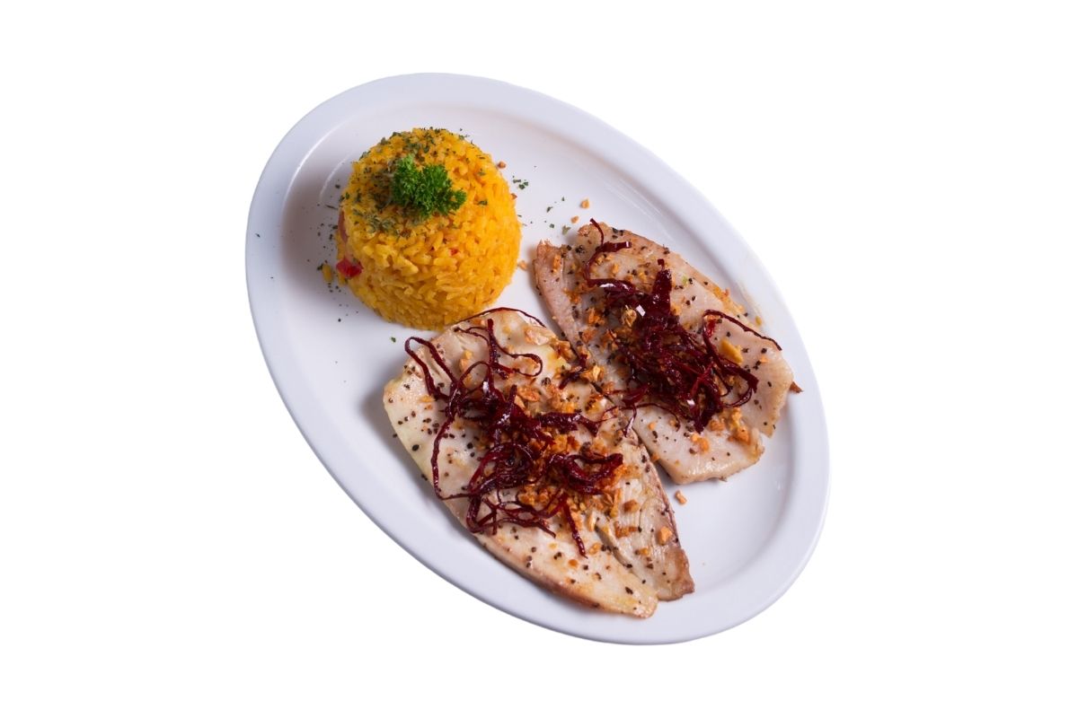 100 gr de filete a la plancha, elaborado con pasta de ajo, julianas de chile guajillo, acompañado con 100 gr de arroz.