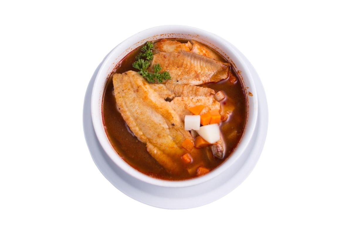 Base de caldo de camarón con filete de pescado sin espinas con almeja, acompañado con papa y zanahoria.