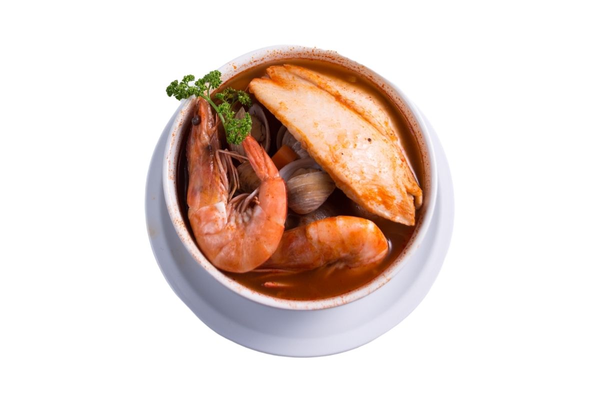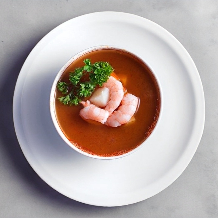 Base de caldo de camarón con camarón pacotilla, filete de pescado sin espina, almeja, acompañado con papa y zanahoria.