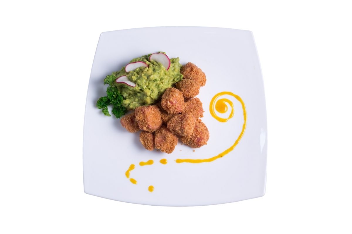 Cubierto con chicharrón de cerdo, frito en aceite de oliva, acompañado con guacamole y arroz.