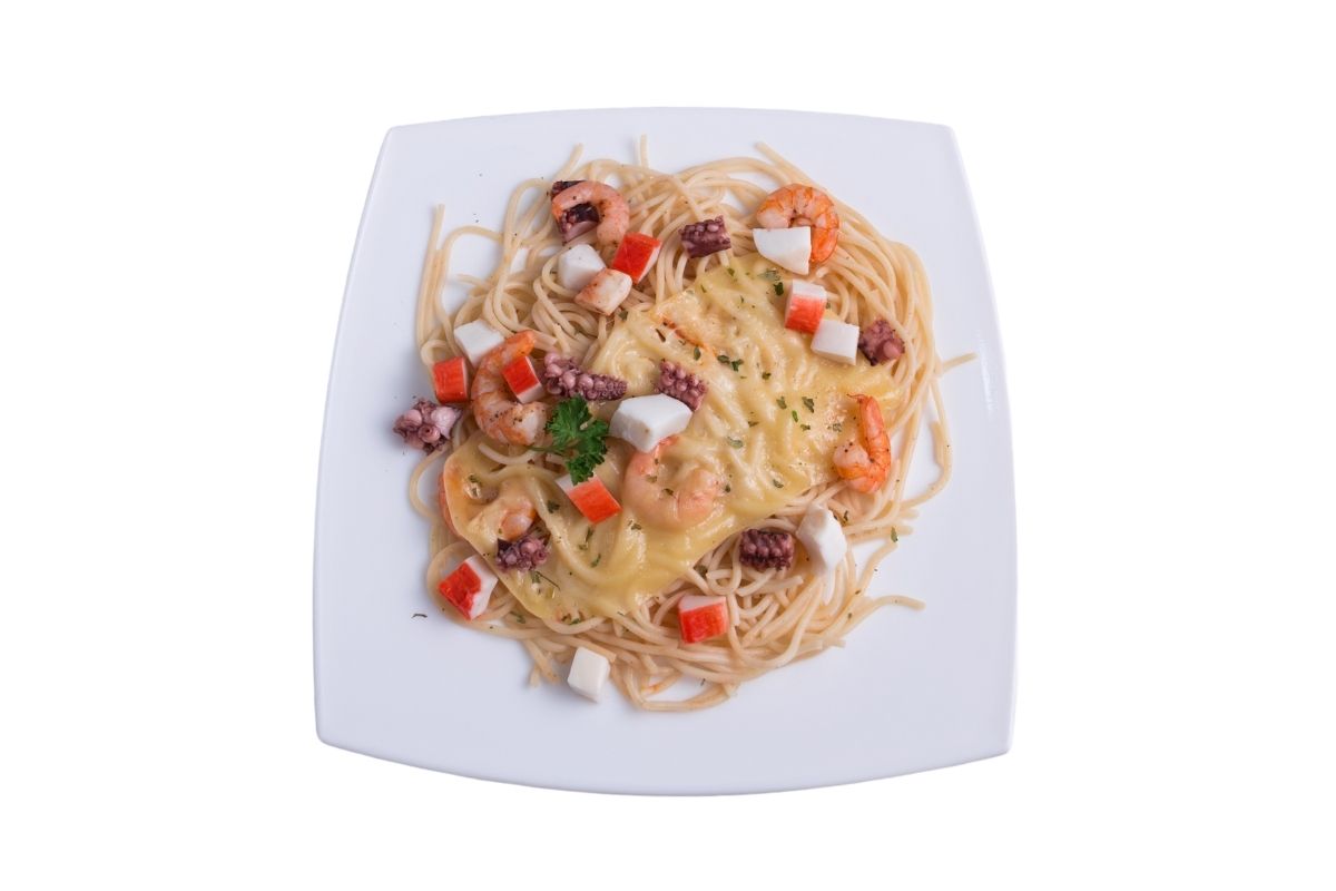 100 gr de pasta con camarón, pulpo, almeja, caracol, surimi elaborado con mantequilla, crema y queso manchego gratinado.