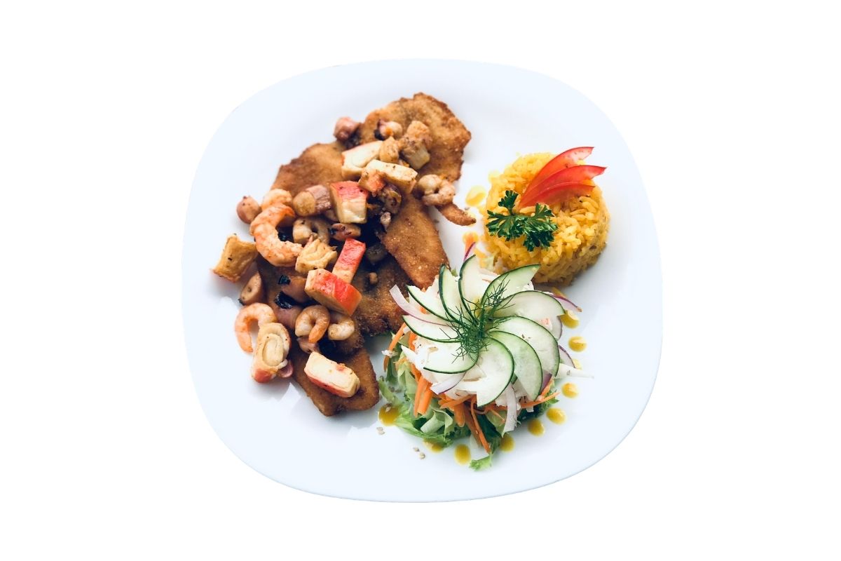 90 gr de pescado bañado con un mix de mariscos a la mantequilla, acompañado con arroz y ensalada.