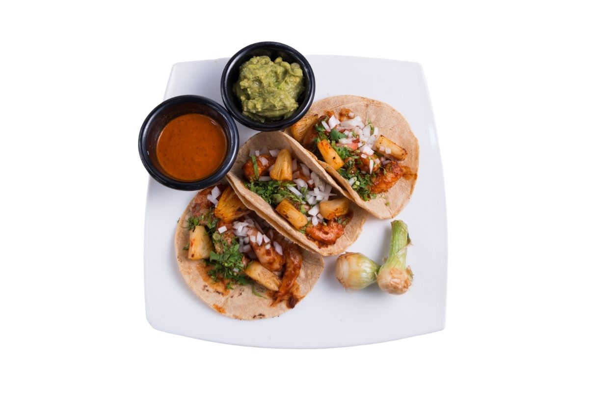 3 Piezas, camarones marinados con salsa de pastor, montados en tortilla de maíz, acompañado de salsa de árbol de la casa, guacamole, cebollas cambray y piña asada con canela.
