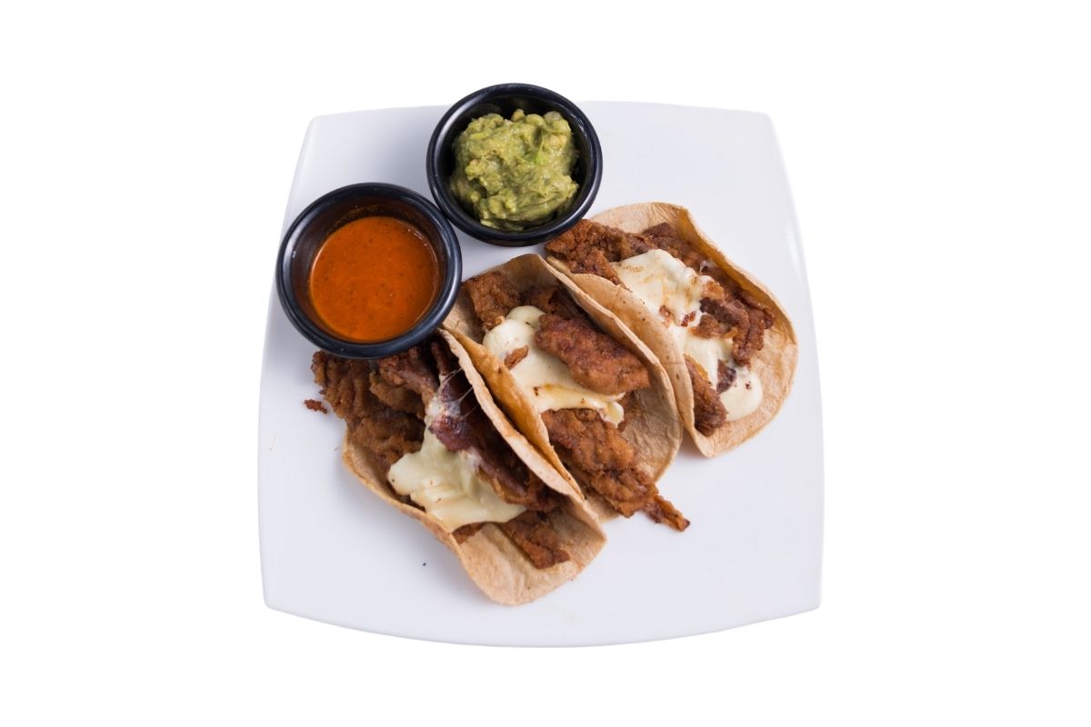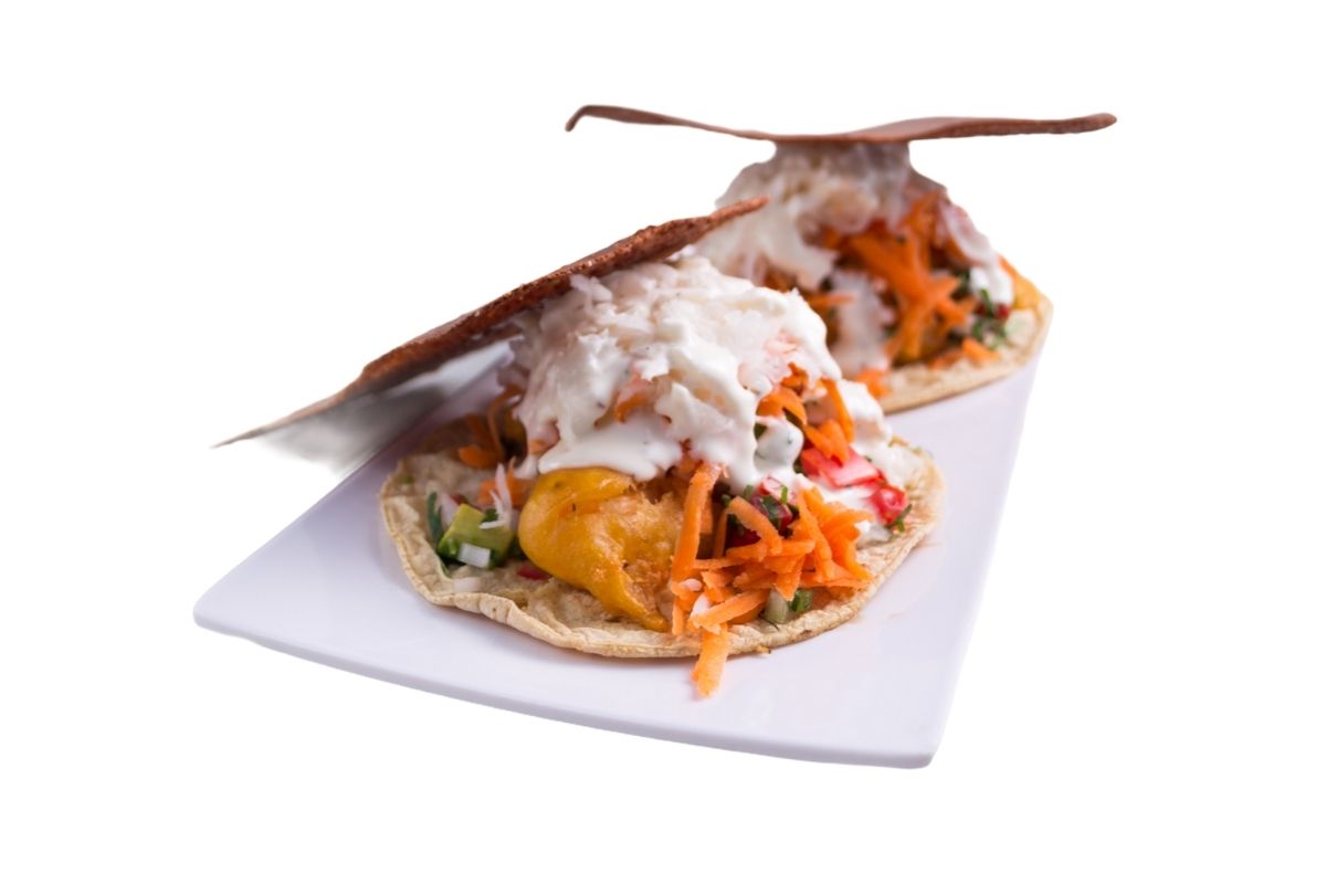 2 Piezas, taco de camarón con queso oaxaca, rebosado en harina, servido con tortillas de maíz, pico de gallo cebolla, jitomate y aguacate, zanahoria, jícama, col morada, aderezo ranch y chicharrón de queso manchego.