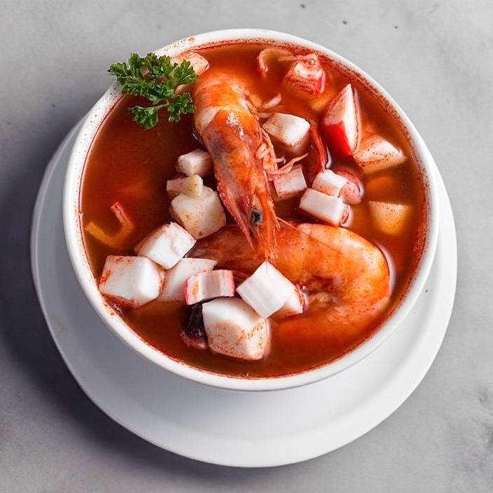 Base de caldo de camarón, elaborado con mix de mariscos, pulpo, caracol, surimi, pescado y camarón, acompañado con almeja, papa y zanahoria.