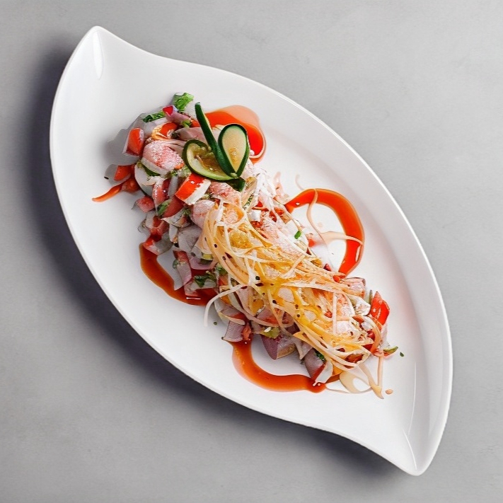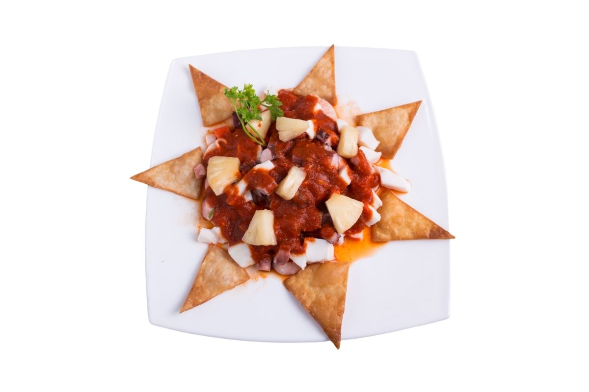 Elaborado con camarón, atún fresco, jugo de ceviche especial de la casa, acompañado con apio, cebolla, cilantro, jitomate, jugo de limón, chile habanero, orégano, aceite de olivo con cuadros de mango natural y aguacate.