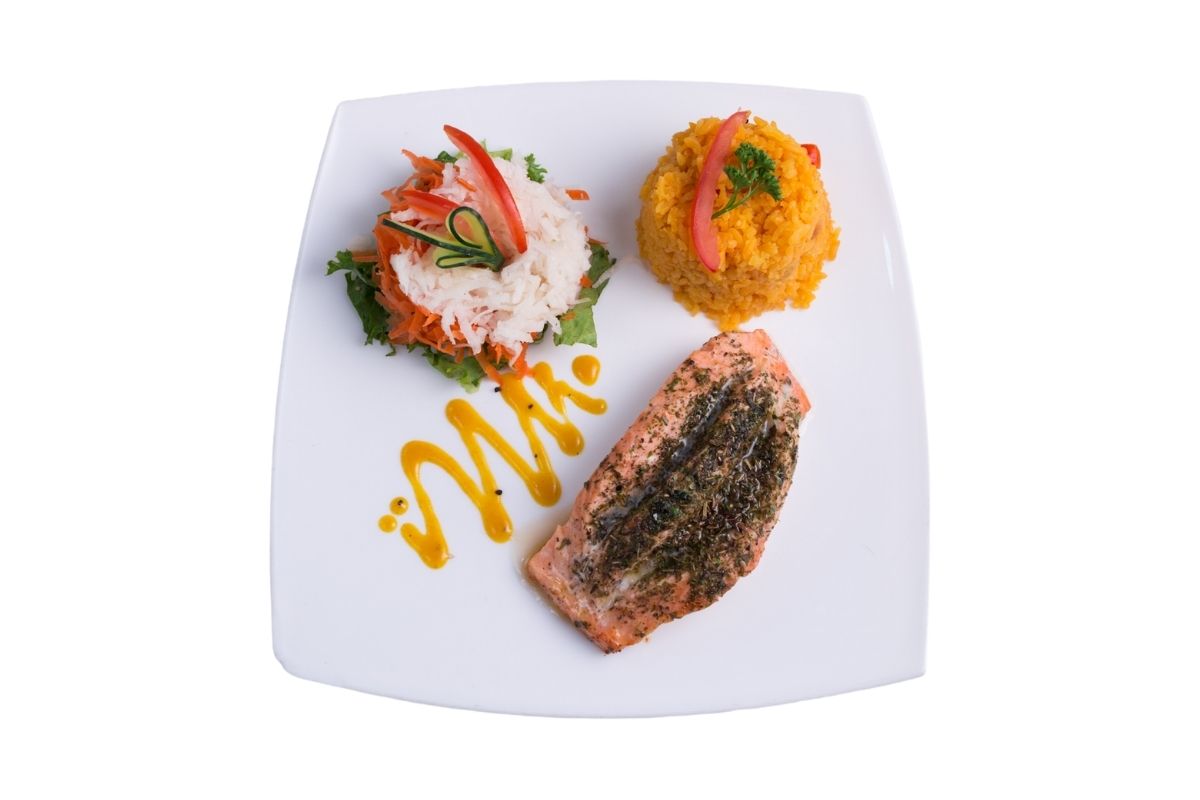 Salmón a la plancha, 170 gr cubierto a las finas hierbas, acompañado de arroz y ensalada.
