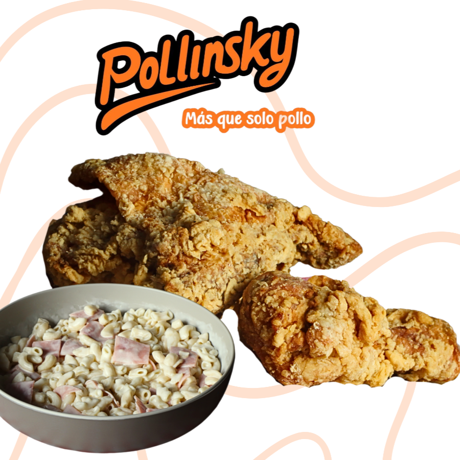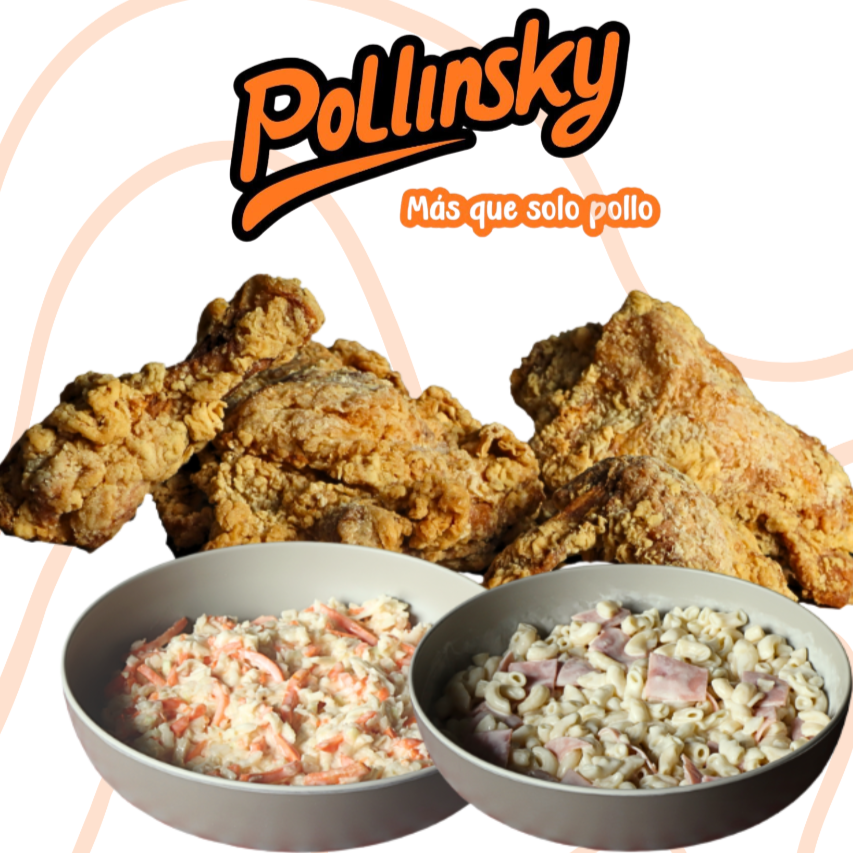 8 Piezas de pollo cruji más 2 complementos grandes a elegir. Puré, ensalada o sopa. Incluye 2 bolsitas de salsa.