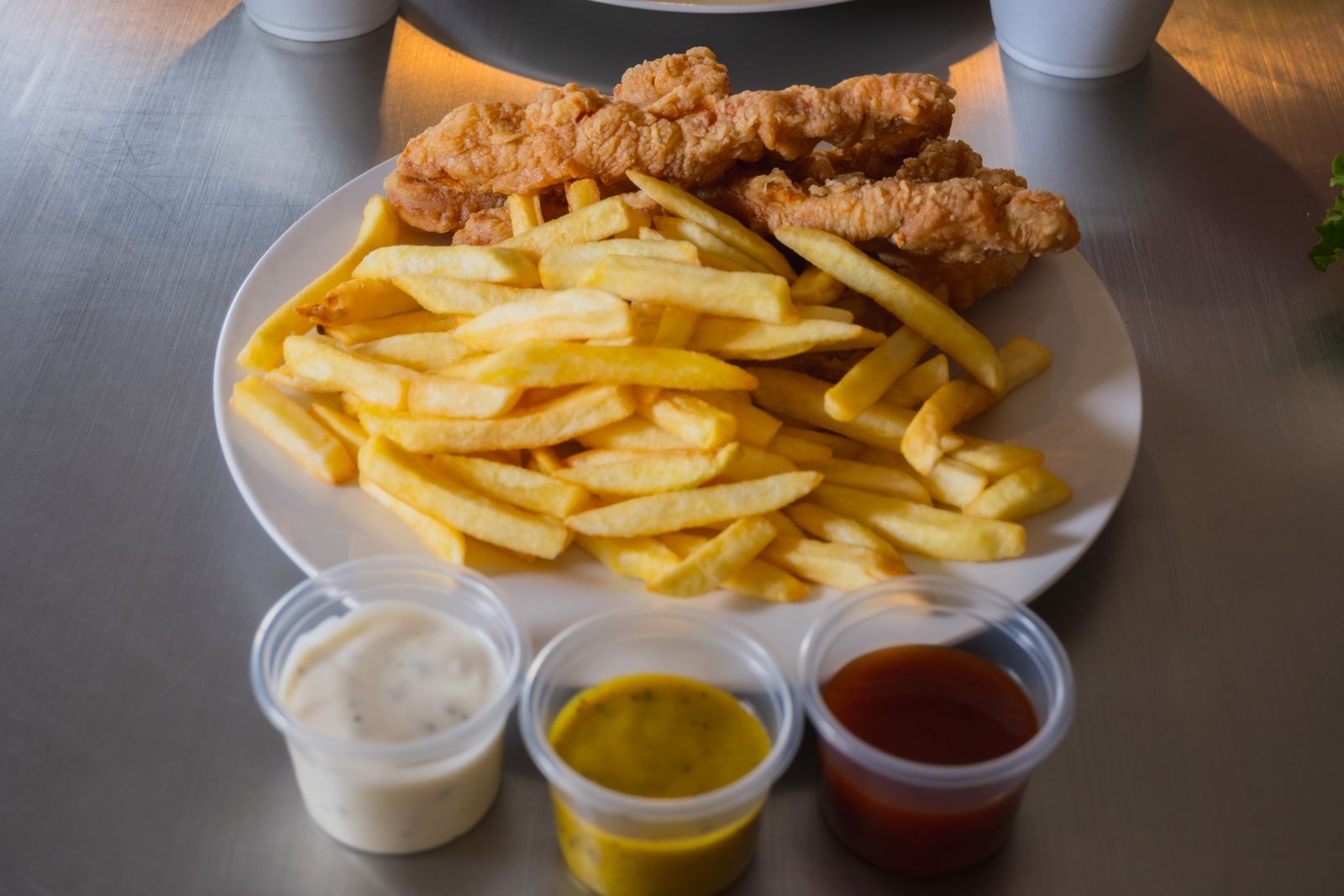Tiras de pollo empanizadas con papas fritas.