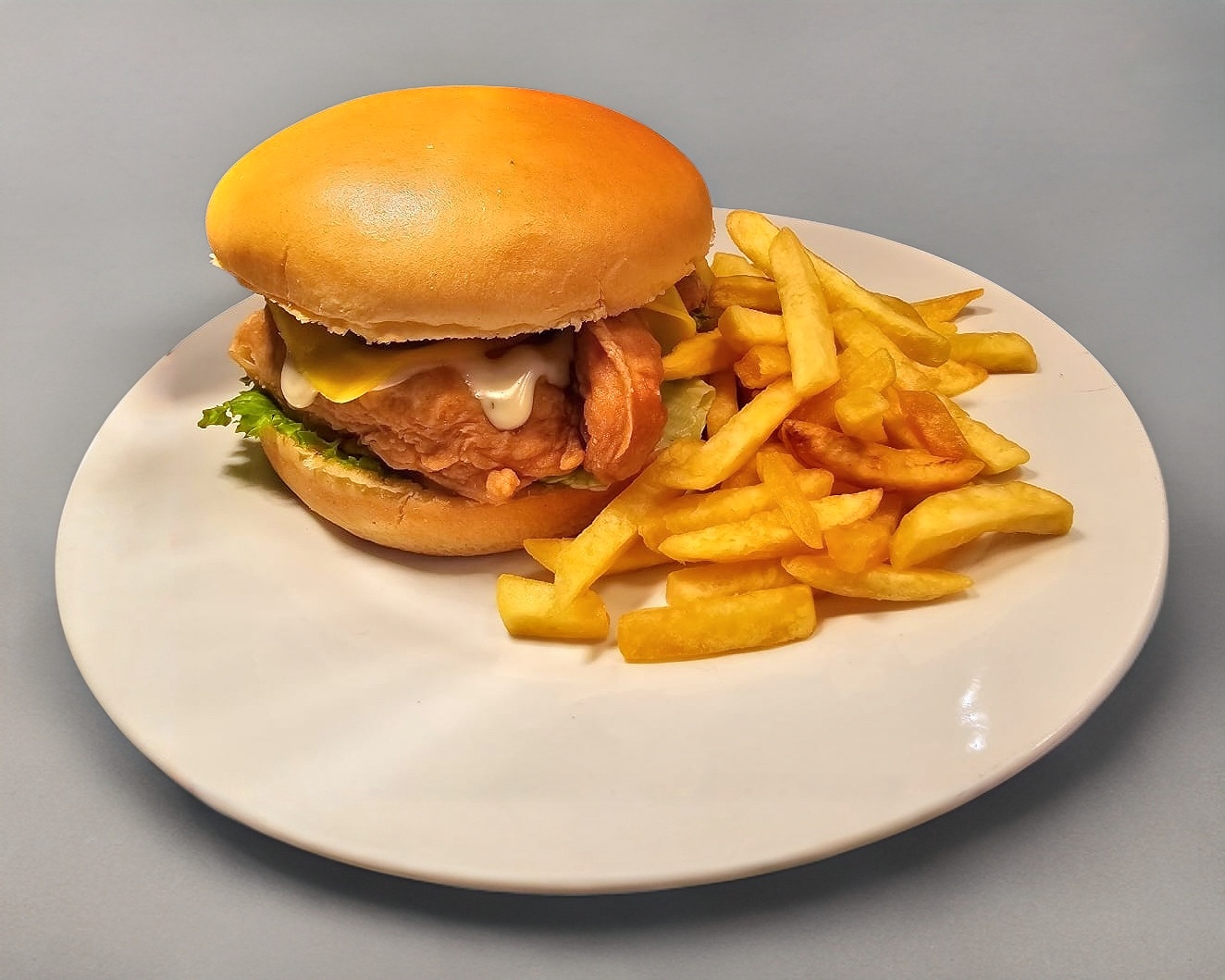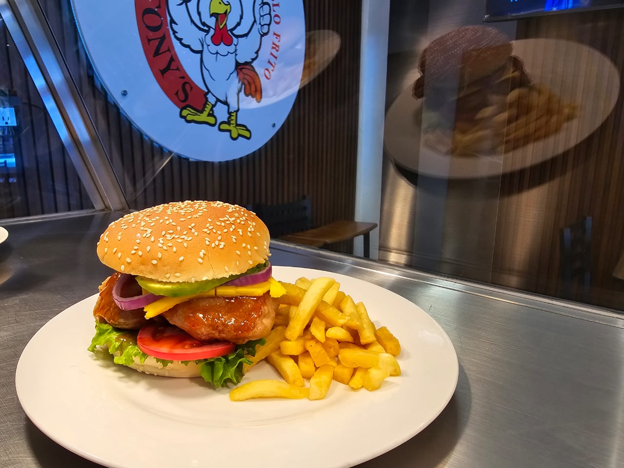 Exquisita hamburguesa de pechuga jugosa por dentro, crujiente por fuera, acompañado de papas