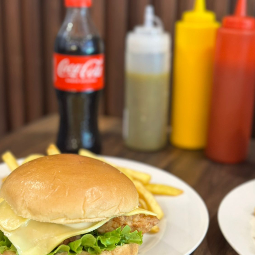 Exquisita Hamburguesa de pechuga, acompañada con papas y refresco