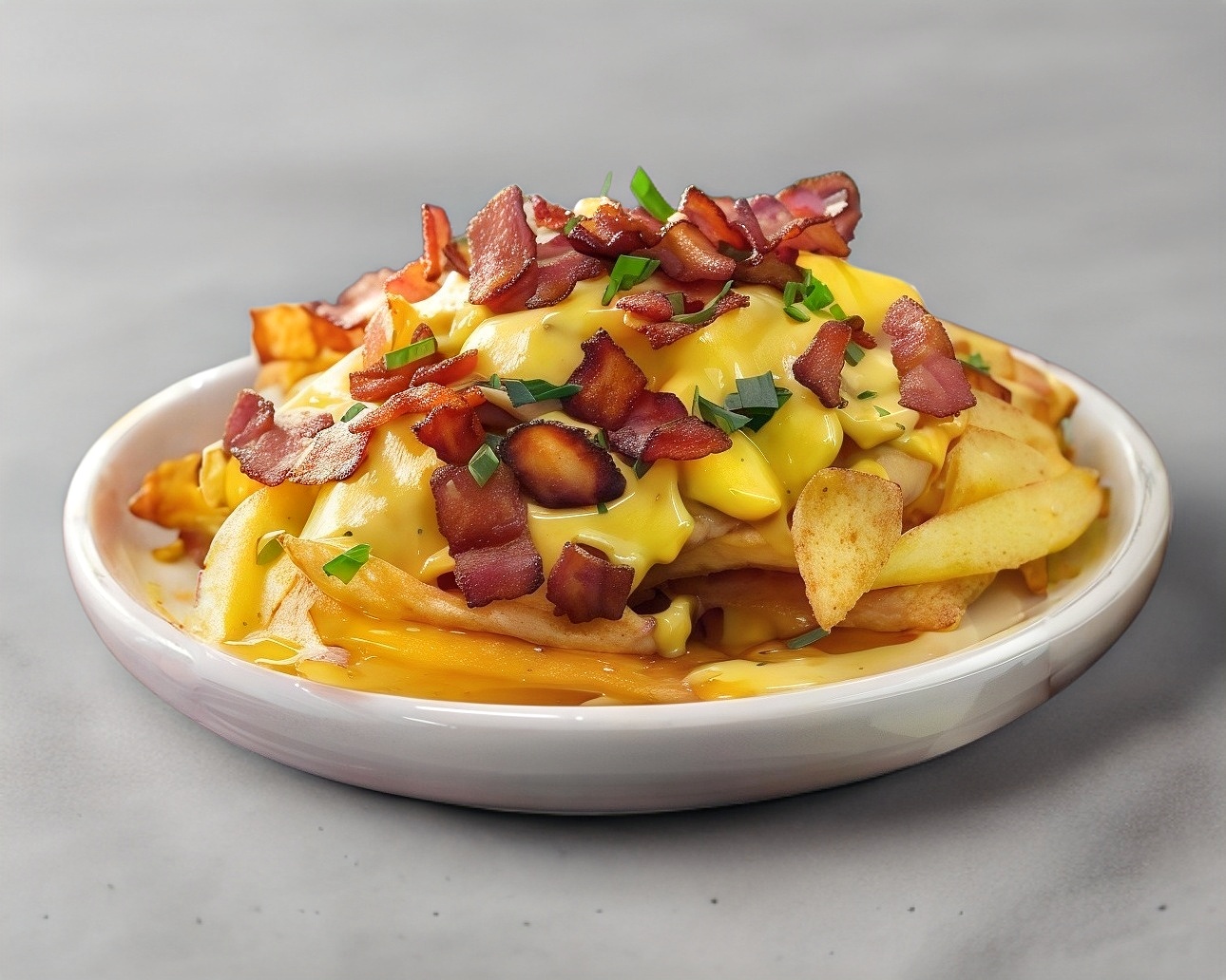 Papas fritas con topping de tocino y queso.